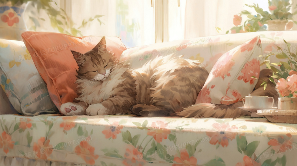 本作品内容为阳光照射着躺在沙发上的猫咪插画, 格式为 jpg, 大小2 MB, 图片尺寸为2912 x 1632, 源文件无水印, 欢迎使用熊猫办公。 如认为平台内容涉嫌侵权,可通过邮件:tousu@tukuppt.com提出书面通知,我们将及时处理。