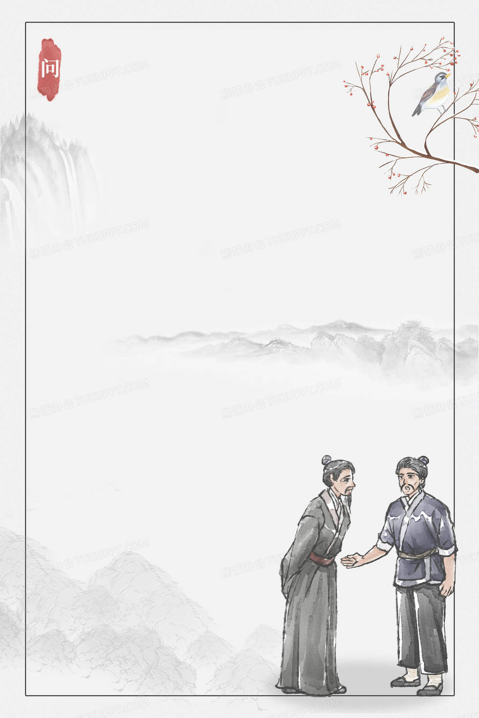 本作品内容为水墨古风中医望闻问切之问合成背景, 格式为 psd, 大小118 MB, 图片尺寸为3543 x 5314, 作品中背景图片无需修改, 源文件无水印,可以直接使用, 欢迎使用熊猫办公。 如认为平台内容涉嫌侵权,可通过邮件:tousu@tukuppt.com提出书面通知,我们将及时处理。