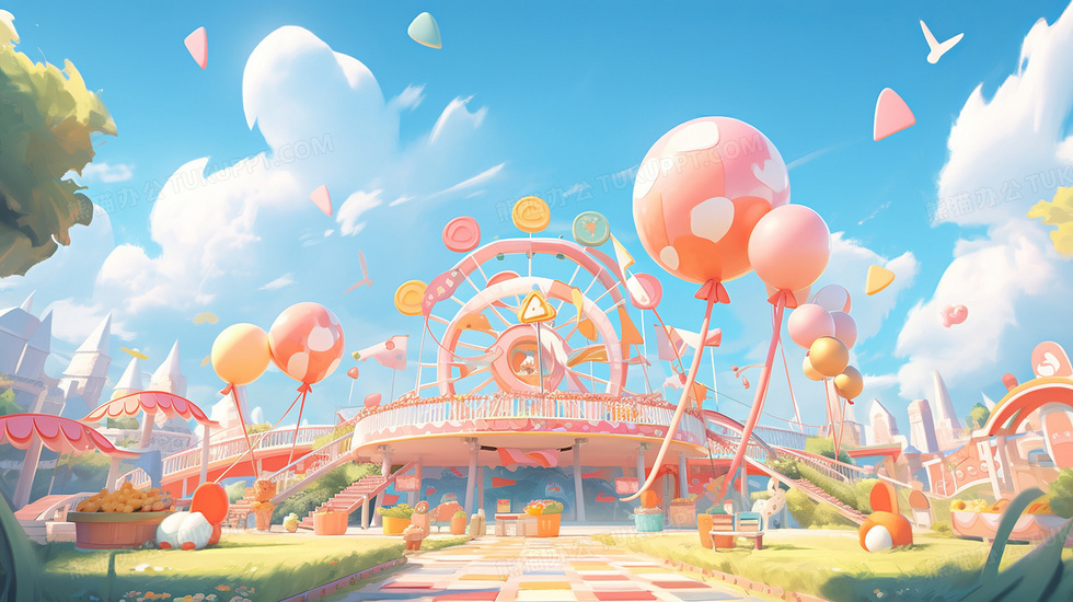 本作品内容为童话般的儿童游乐园旋转木马创意插画, 格式为 jpg, 大小3 MB, 图片尺寸为2912 x 1632, 源文件无水印, 欢迎使用熊猫办公。 如认为平台内容涉嫌侵权,可通过邮件:tousu@tukuppt.com提出书面通知,我们将及时处理。
