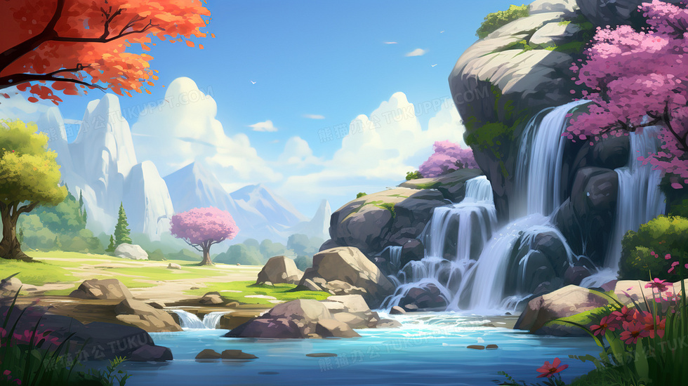 本作品内容为春天大自然瀑布河流山水美景插画, 格式为 jpg, 大小5 MB, 图片尺寸为2912 x 1632, 源文件无水印, 欢迎使用熊猫办公。 如认为平台内容涉嫌侵权,可通过邮件:tousu@tukuppt.com提出书面通知,我们将及时处理。
