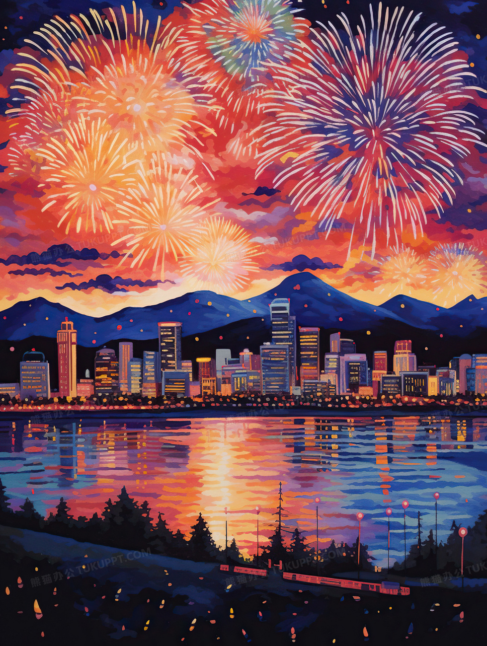 本作品内容为2024龙年新年烟花过年插画, 格式为 jpg, 大小8 MB, 图片尺寸为1856 x 2464, 源文件无水印, 欢迎使用熊猫办公。 如认为平台内容涉嫌侵权,可通过邮件:tousu@tukuppt.com提出书面通知,我们将及时处理。
