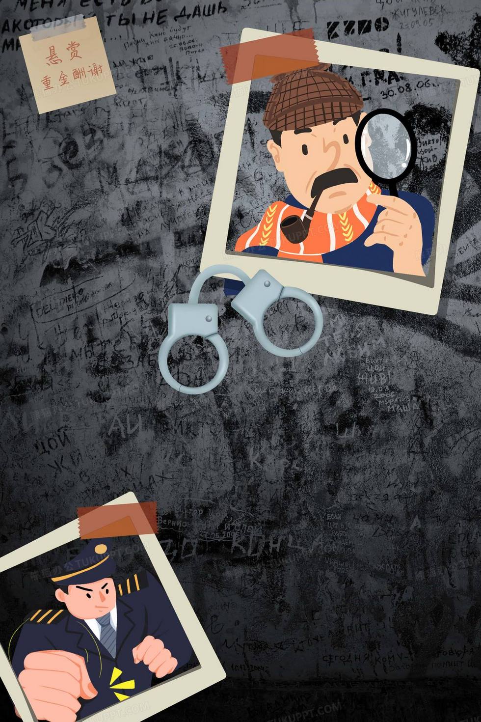 本作品内容为手绘趣味的侦探破案摄影合成背景, 格式为 psd, 大小44 MB, 图片尺寸为2362 x 3543, 作品中背景图片无需修改, 源文件无水印,可以直接使用, 欢迎使用熊猫办公。 如认为平台内容涉嫌侵权,可通过邮件:tousu@tukuppt.com提出书面通知,我们将及时处理。