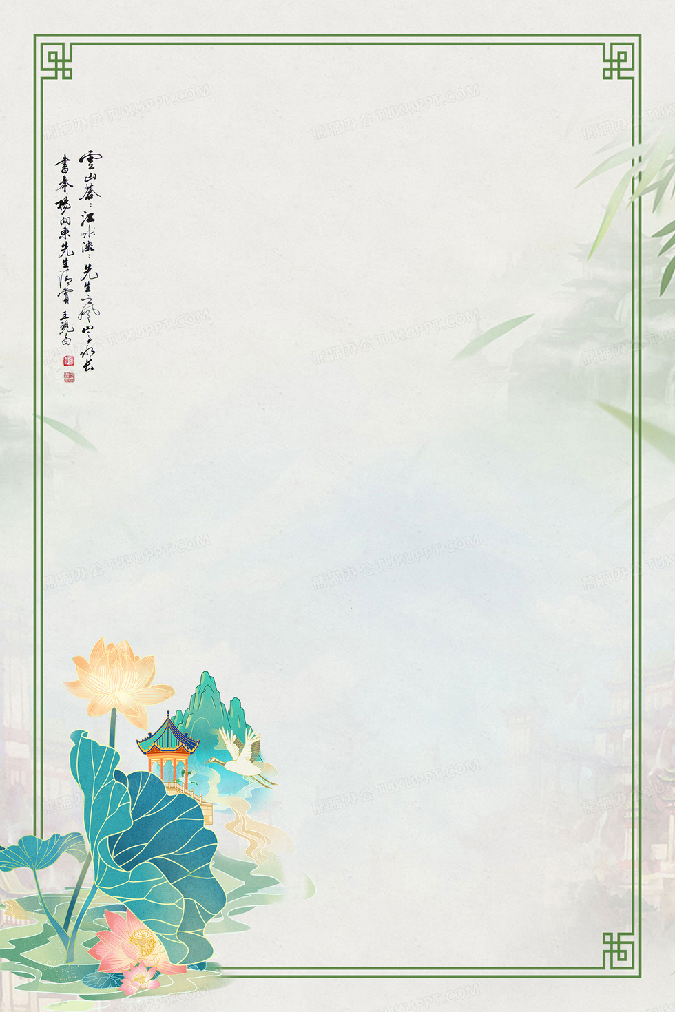 本作品内容为古风唯美荷花边框背景, 格式为 psd, 大小39 MB, 图片尺寸为3543 x 5315, 作品中背景图片无需修改, 源文件无水印,可以直接使用, 欢迎使用熊猫办公。 如认为平台内容涉嫌侵权,可通过邮件:tousu@tukuppt.com提出书面通知,我们将及时处理。