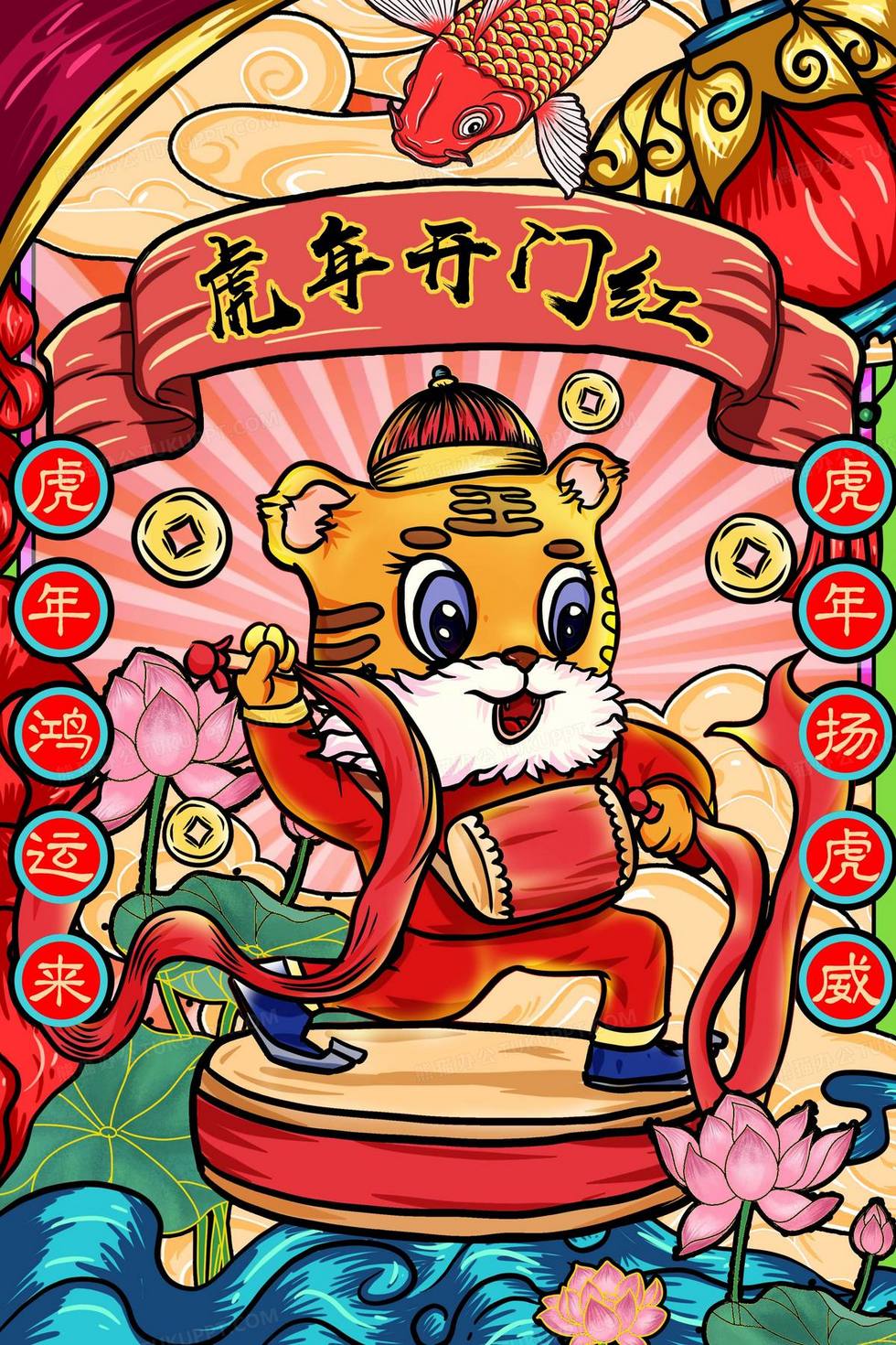 本作品内容为虎年国潮趣味合成插画风背景, 格式为 psd, 大小36 MB, 图片尺寸为2362 x 3543, 作品中背景图片无需修改, 源文件无水印,可以直接使用, 欢迎使用熊猫办公。 如认为平台内容涉嫌侵权,可通过邮件:tousu@tukuppt.com提出书面通知,我们将及时处理。