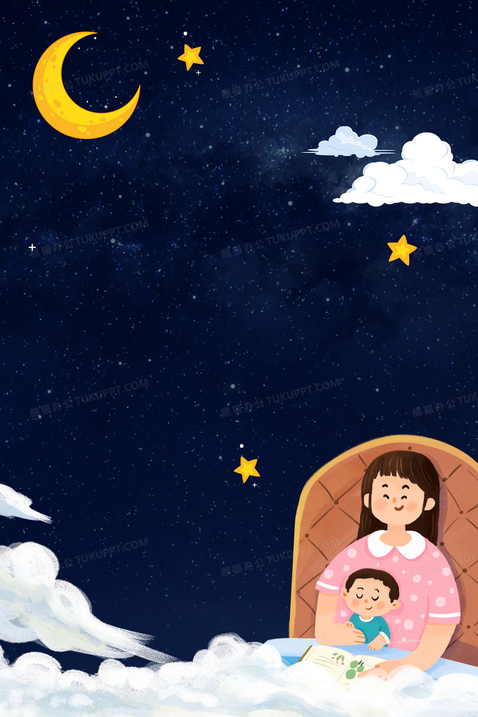 本作品内容为简约夜晚亲子阅读背景图, 格式为 psd, 大小88 MB, 图片尺寸为3543 x 5315, 作品中背景图片无需修改, 源文件无水印,可以直接使用, 欢迎使用熊猫办公。 如认为平台内容涉嫌侵权,可通过邮件:tousu@tukuppt.com提出书面通知,我们将及时处理。