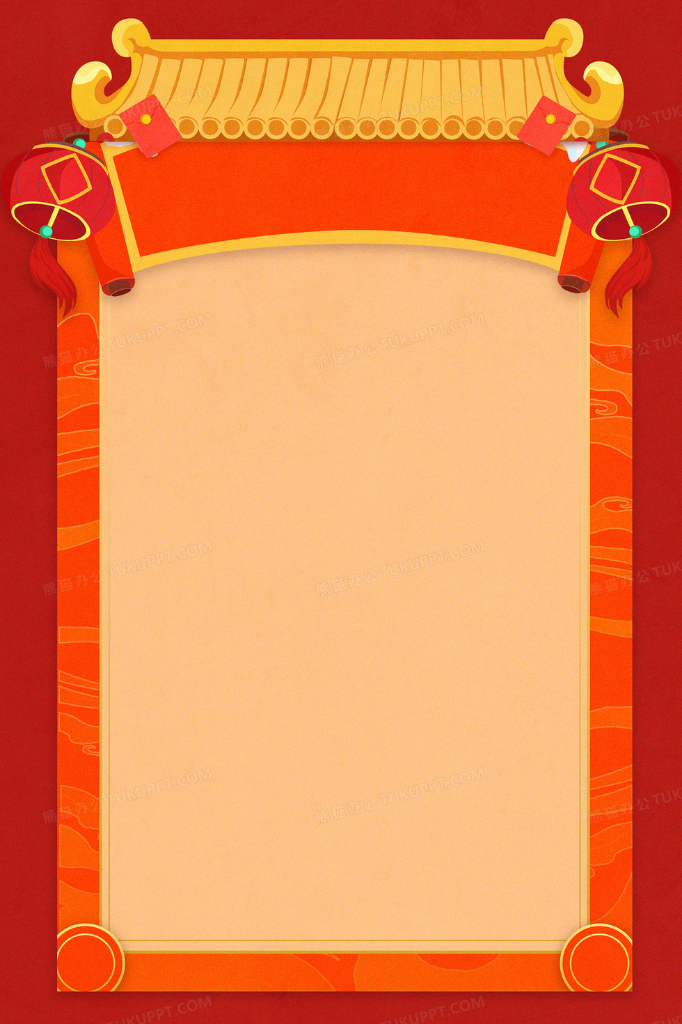 本作品内容为红色中国风门头卷轴边框背景, 格式为 psd, 大小158 MB, 图片尺寸为3543 x 5315, 作品中背景图片无需修改, 源文件无水印,可以直接使用, 欢迎使用熊猫办公。 如认为平台内容涉嫌侵权,可通过邮件:tousu@tukuppt.com提出书面通知,我们将及时处理。