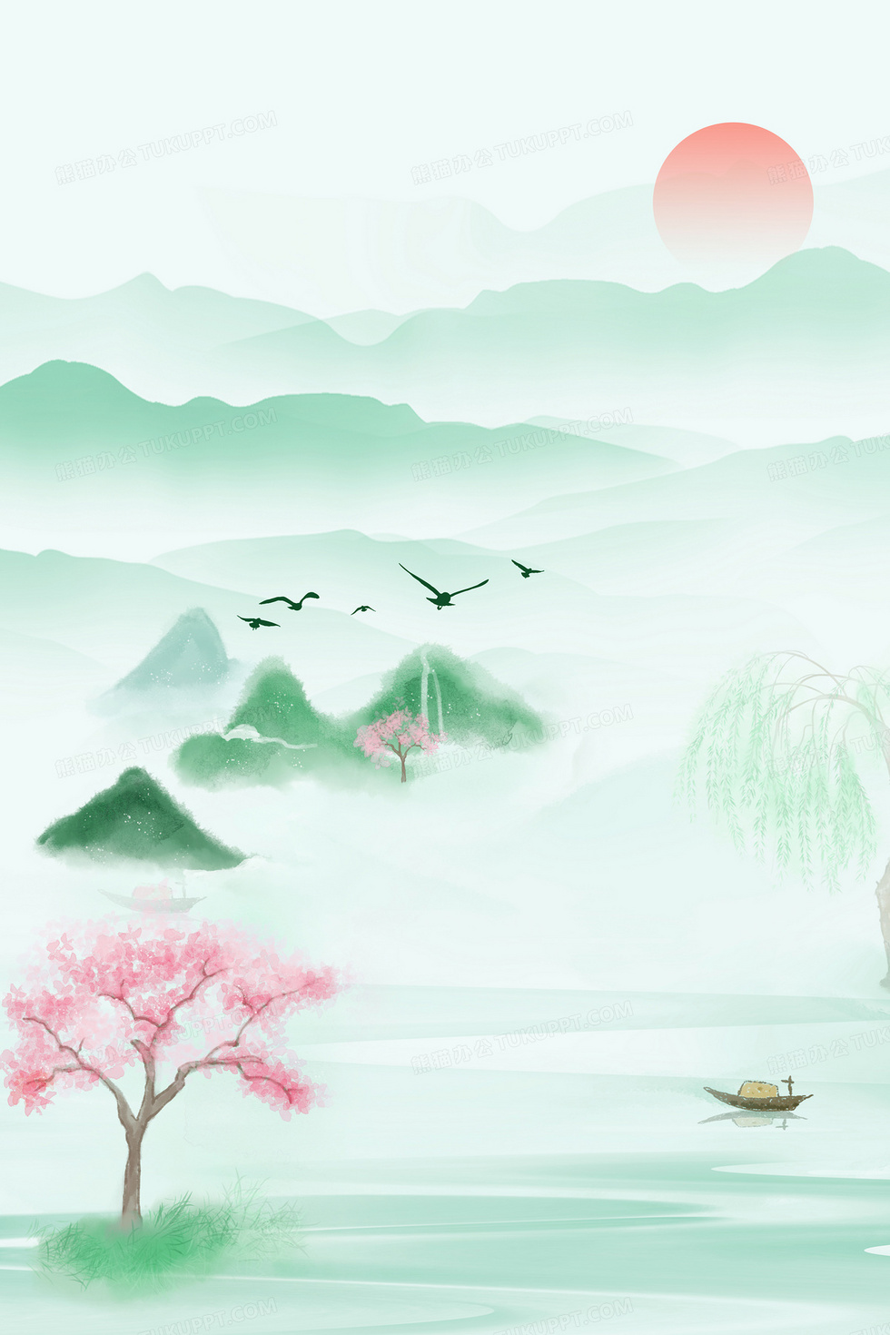 本作品内容为绿色水墨春天背景图, 格式为 psd, 大小69 MB, 图片尺寸为3543 x 5315, 作品中背景图片无需修改, 源文件无水印,可以直接使用, 欢迎使用熊猫办公。 如认为平台内容涉嫌侵权,可通过邮件:tousu@tukuppt.com提出书面通知,我们将及时处理。