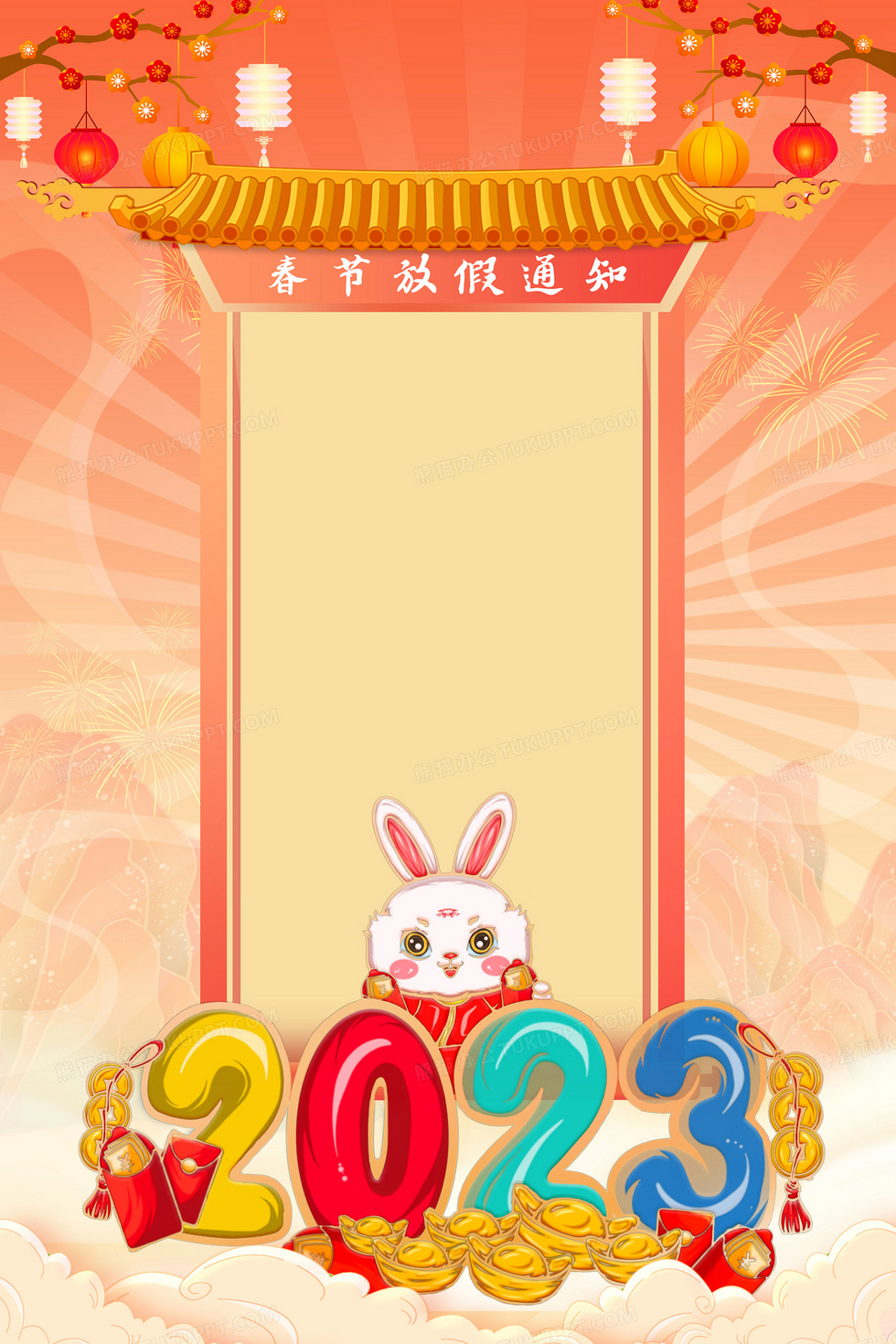 本作品内容为2023新年春节放假通知卡通中国风背景, 格式为 psd, 大小46 MB, 图片尺寸为3543 x 5315, 作品中背景图片无需修改, 源文件无水印,可以直接使用, 欢迎使用熊猫办公。 如认为平台内容涉嫌侵权,可通过邮件:tousu@tukuppt.com提出书面通知,我们将及时处理。