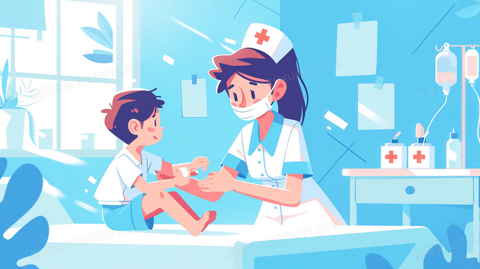 本作品内容为医院护士给受伤的男孩包扎插画, 格式为 jpg, 大小2 MB, 图片尺寸为2912 x 1632, 源文件无水印, 欢迎使用熊猫办公。 如认为平台内容涉嫌侵权,可通过邮件:tousu@tukuppt.com提出书面通知,我们将及时处理。
