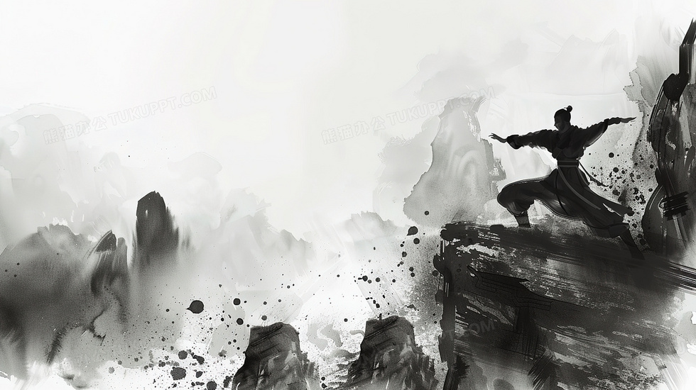 本作品内容为中华武术水墨背景, 格式为 jpg, 大小3 MB, 图片尺寸为2912 x 1632, 作品中背景图片无需修改, 源文件无水印,可以直接使用, 欢迎使用熊猫办公。 如认为平台内容涉嫌侵权,可通过邮件:tousu@tukuppt.com提出书面通知,我们将及时处理。