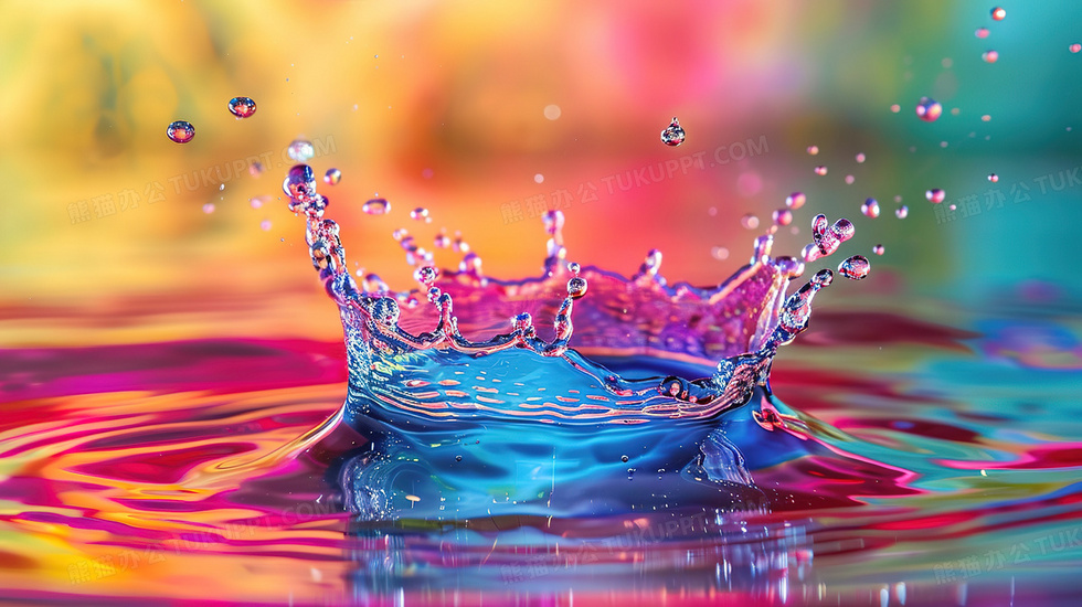本作品内容为彩色飞溅的液体水滴背景, 格式为 jpg, 大小3 MB, 图片尺寸为2912 x 1632, 作品中背景图片无需修改, 源文件无水印,可以直接使用, 欢迎使用熊猫办公。 如认为平台内容涉嫌侵权,可通过邮件:tousu@tukuppt.com提出书面通知,我们将及时处理。