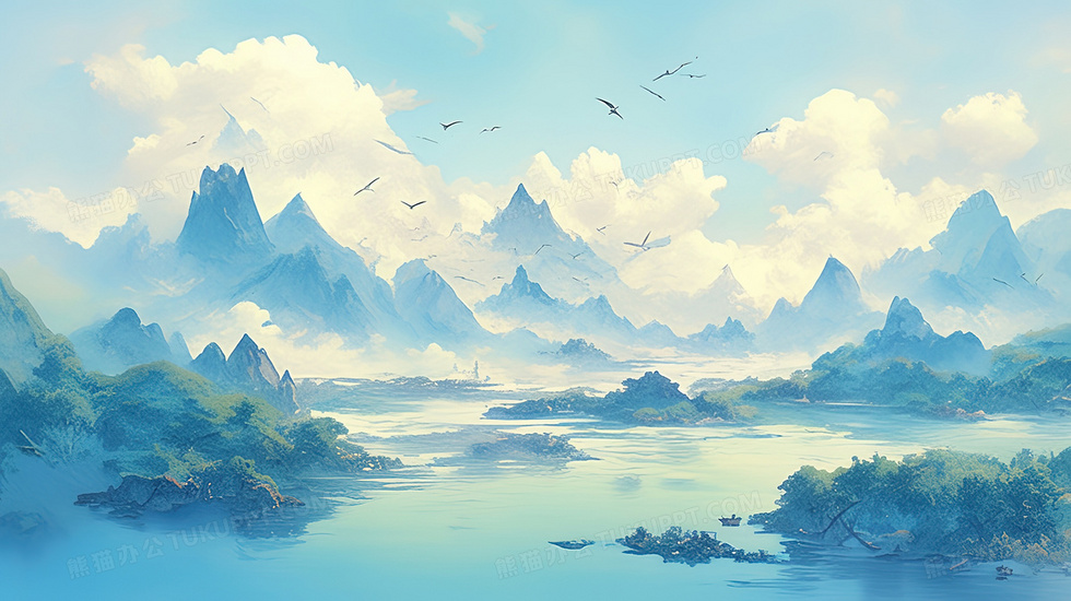 本作品内容为蓝色唯美意境山水大自然风景插画, 格式为 jpg, 大小3 MB, 图片尺寸为2912 x 1632, 源文件无水印, 欢迎使用熊猫办公。 如认为平台内容涉嫌侵权,可通过邮件:tousu@tukuppt.com提出书面通知,我们将及时处理。