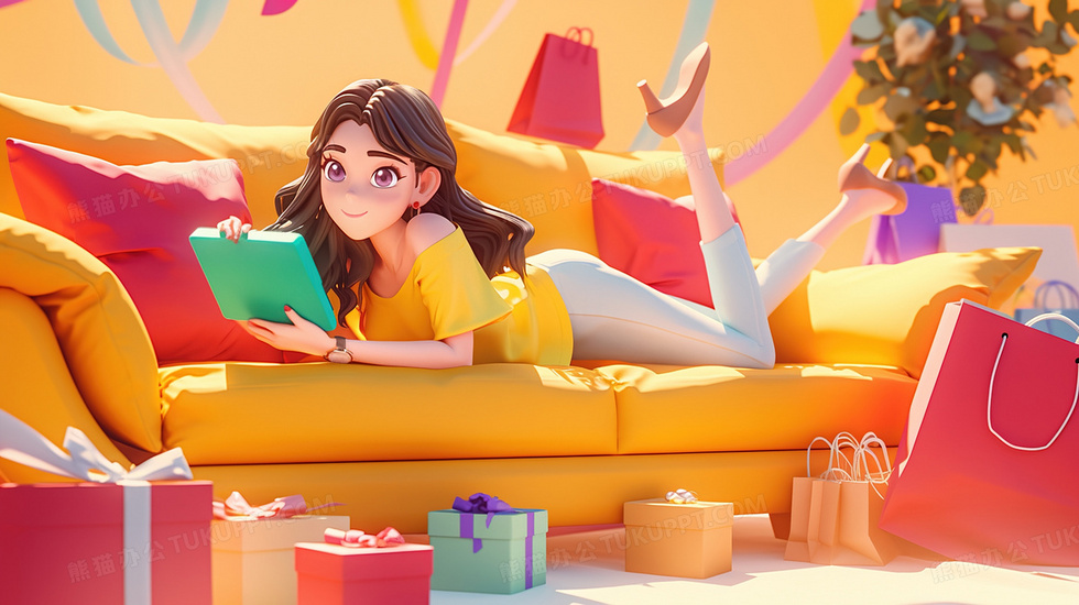 本作品内容为趴在沙发购物的时尚女孩插画, 格式为 jpg, 大小2 MB, 图片尺寸为2912 x 1632, 源文件无水印, 欢迎使用熊猫办公。 如认为平台内容涉嫌侵权,可通过邮件:tousu@tukuppt.com提出书面通知,我们将及时处理。