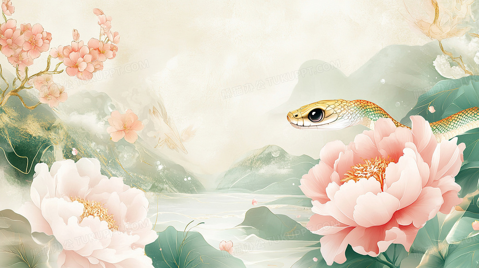 本作品内容为唯美中国风牡丹花蛇年背景图, 格式为 jpg, 大小3 MB, 图片尺寸为2912 x 1632, 作品中背景图片无需修改, 源文件无水印,可以直接使用, 欢迎使用熊猫办公。 如认为平台内容涉嫌侵权,可通过邮件:tousu@tukuppt.com提出书面通知,我们将及时处理。