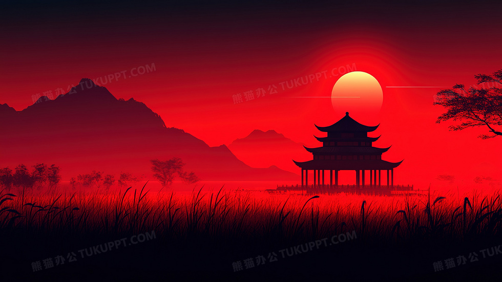 本作品内容为红色高级感古建筑剪影背景, 格式为 jpg, 大小2 MB, 图片尺寸为2912 x 1632, 作品中背景图片无需修改, 源文件无水印,可以直接使用, 欢迎使用熊猫办公。 如认为平台内容涉嫌侵权,可通过邮件:tousu@tukuppt.com提出书面通知,我们将及时处理。