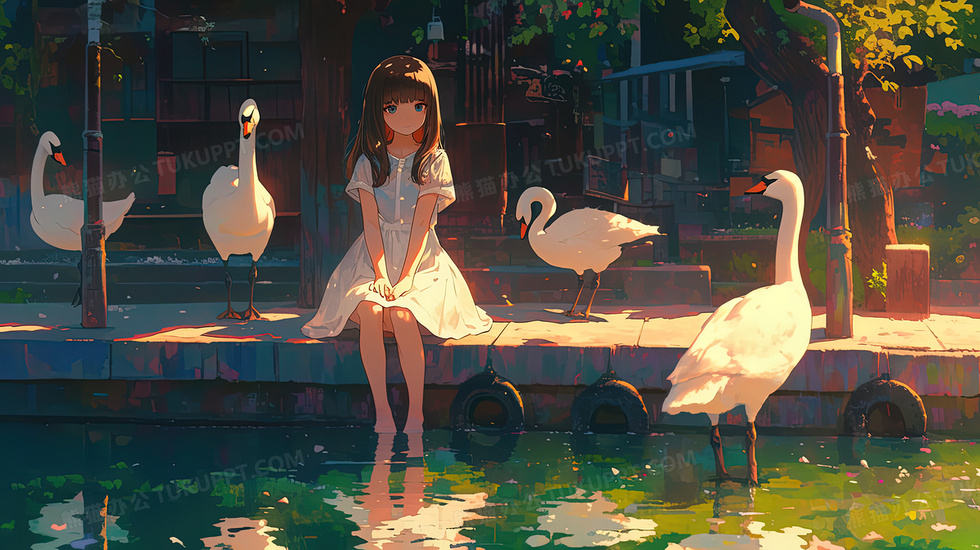 本作品内容为夏天坐在池塘看天鹅的少女插画, 格式为 jpg, 大小5 MB, 图片尺寸为2912 x 1632, 源文件无水印, 欢迎使用熊猫办公。 如认为平台内容涉嫌侵权,可通过邮件:tousu@tukuppt.com提出书面通知,我们将及时处理。