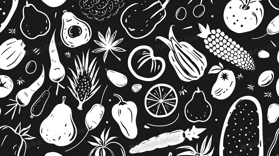 本作品内容为黑白蔬菜水果底纹背景, 格式为 jpg, 大小3 MB, 图片尺寸为2912 x 1632, 作品中背景图片无需修改, 源文件无水印,可以直接使用, 欢迎使用熊猫办公。 如认为平台内容涉嫌侵权,可通过邮件:tousu@tukuppt.com提出书面通知,我们将及时处理。
