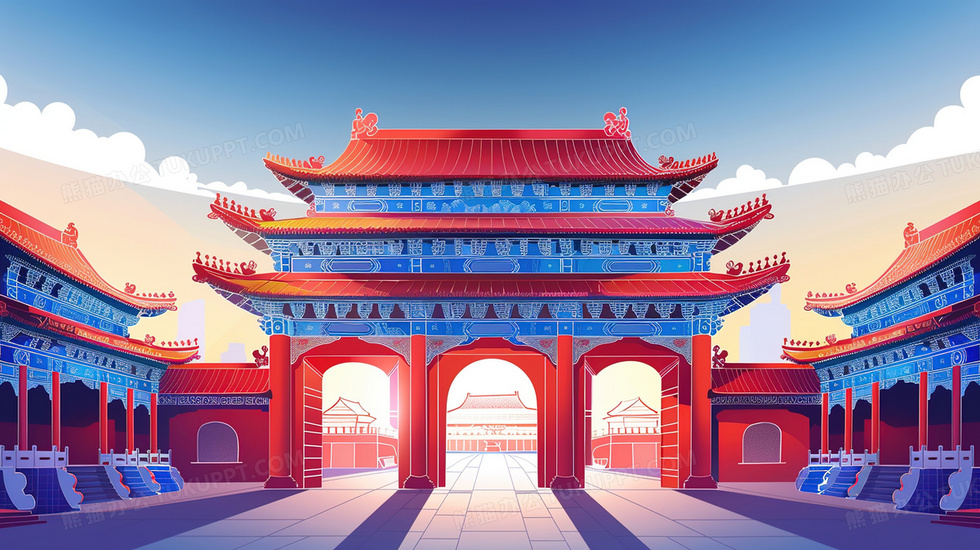 本作品内容为唯美中式门楼建筑插画, 格式为 jpg, 大小3 MB, 图片尺寸为2912 x 1632, 源文件无水印, 欢迎使用熊猫办公。 如认为平台内容涉嫌侵权,可通过邮件:tousu@tukuppt.com提出书面通知,我们将及时处理。