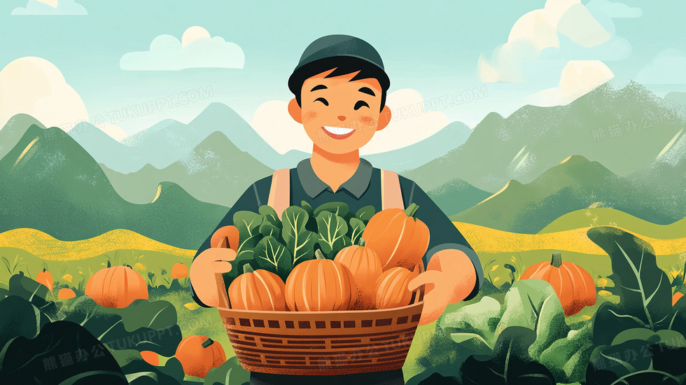 本作品内容为秋天菜地丰收庄稼农民插画, 格式为 jpg, 大小3 MB, 图片尺寸为2912 x 1632, 源文件无水印, 欢迎使用熊猫办公。 如认为平台内容涉嫌侵权,可通过邮件:tousu@tukuppt.com提出书面通知,我们将及时处理。