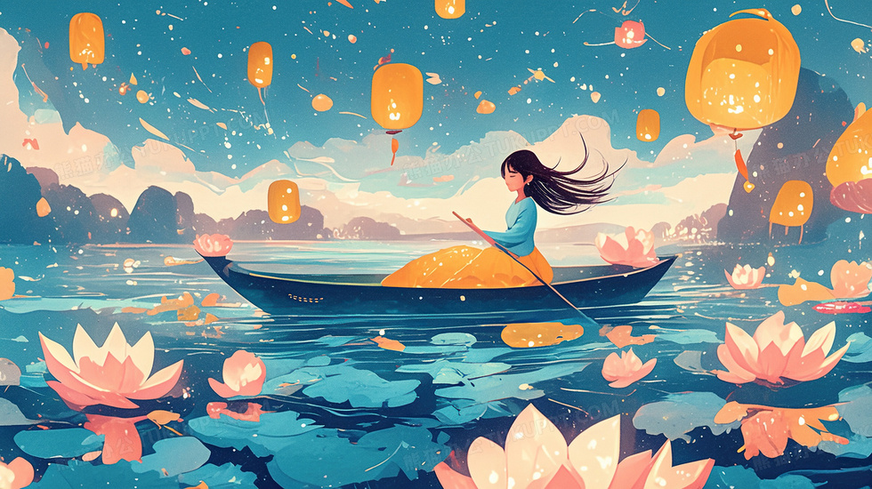 首页 > 插画 > 科技艺术 > 卡通漫画 > 卡通女孩中元节划船放河灯插画