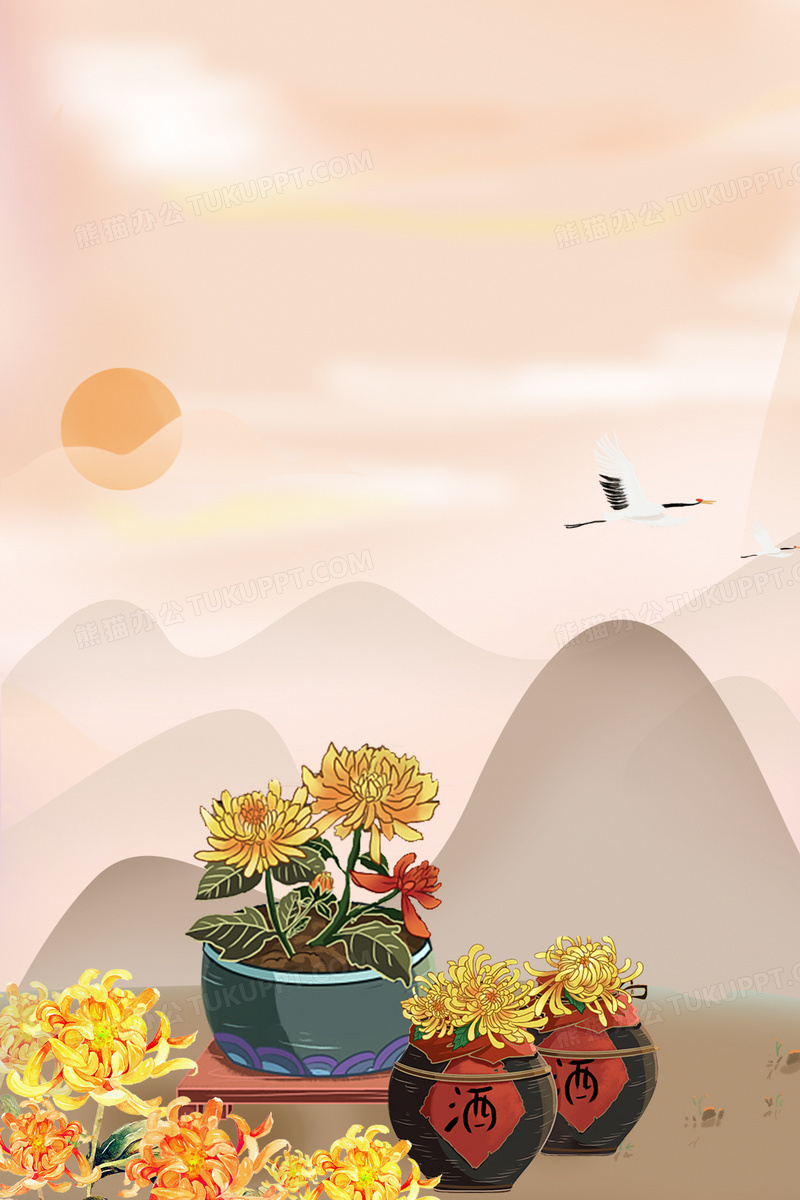 本作品内容为手绘中国风重阳佳节赏菊喝菊花酒背景, 格式为 psd, 大小11 MB, 图片尺寸为1181 x 1772, 作品中背景图片无需修改, 源文件无水印,可以直接使用, 欢迎使用熊猫办公。 如认为平台内容涉嫌侵权,可通过邮件:tousu@tukuppt.com提出书面通知,我们将及时处理。
