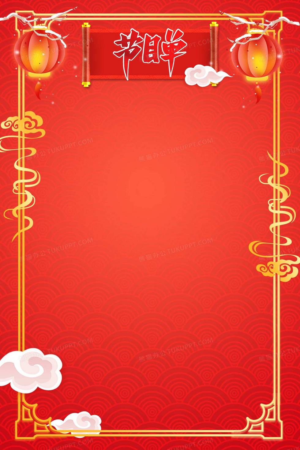 本作品内容为红色新年晚会年会节目单简约背景, 格式为 psd, 大小24 MB, 图片尺寸为2362 x 3543, 作品中背景图片无需修改, 源文件无水印,可以直接使用, 欢迎使用熊猫办公。 如认为平台内容涉嫌侵权,可通过邮件:tousu@tukuppt.com提出书面通知,我们将及时处理。