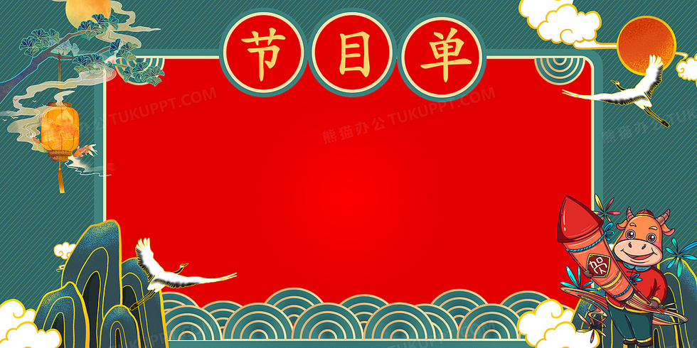 本作品内容为绿色国潮风新年年会节目单背景, 格式为 psd, 大小60 MB, 图片尺寸为7087 x 3543, 作品中背景图片无需修改, 源文件无水印,可以直接使用, 欢迎使用熊猫办公。 如认为平台内容涉嫌侵权,可通过邮件:tousu@tukuppt.com提出书面通知,我们将及时处理。