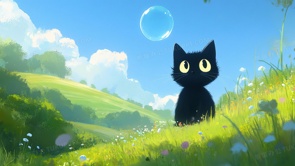 本作品内容为草地黑猫梦幻治愈唯美风景插画, 格式为 jpg, 大小4 MB, 图片尺寸为2912 x 1632, 源文件无水印, 欢迎使用熊猫办公。 如认为平台内容涉嫌侵权,可通过邮件:tousu@tukuppt.com提出书面通知,我们将及时处理。