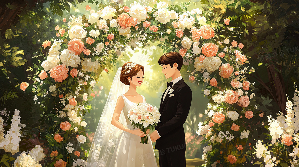 本作品内容为唯美花墙前的幸福新婚夫妻插画, 格式为 jpg, 大小4 MB, 图片尺寸为2912 x 1632, 源文件无水印, 欢迎使用熊猫办公。 如认为平台内容涉嫌侵权,可通过邮件:tousu@tukuppt.com提出书面通知,我们将及时处理。