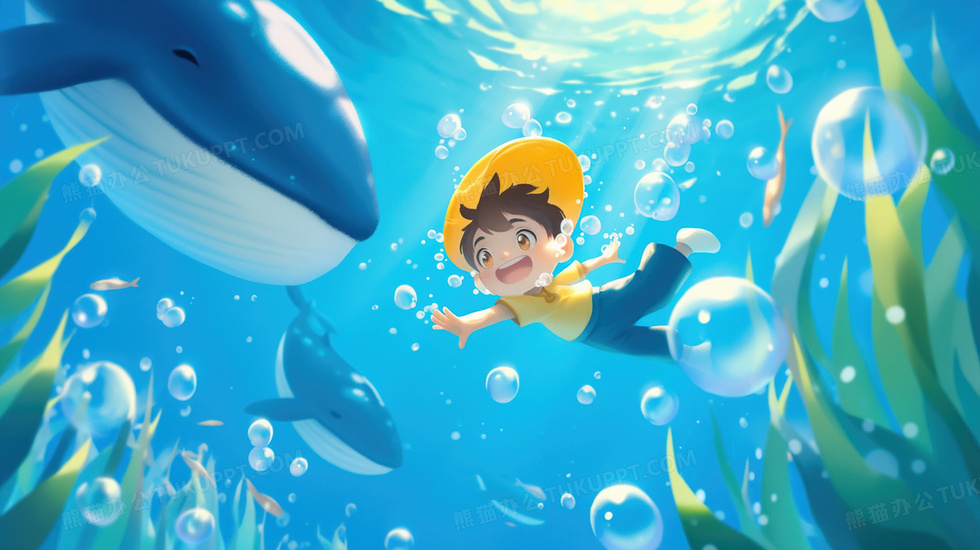 本作品内容为海底潜水卡通男孩与鲸鱼插画, 格式为 jpg, 大小3 MB, 图片尺寸为2912 x 1632, 源文件无水印, 欢迎使用熊猫办公。 如认为平台内容涉嫌侵权,可通过邮件:tousu@tukuppt.com提出书面通知,我们将及时处理。