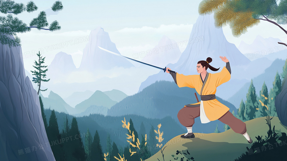 本作品内容为古代男子舞剑中国功夫插画, 格式为 jpg, 大小3 MB, 图片尺寸为2912 x 1632, 源文件无水印, 欢迎使用熊猫办公。 如认为平台内容涉嫌侵权,可通过邮件:tousu@tukuppt.com提出书面通知,我们将及时处理。