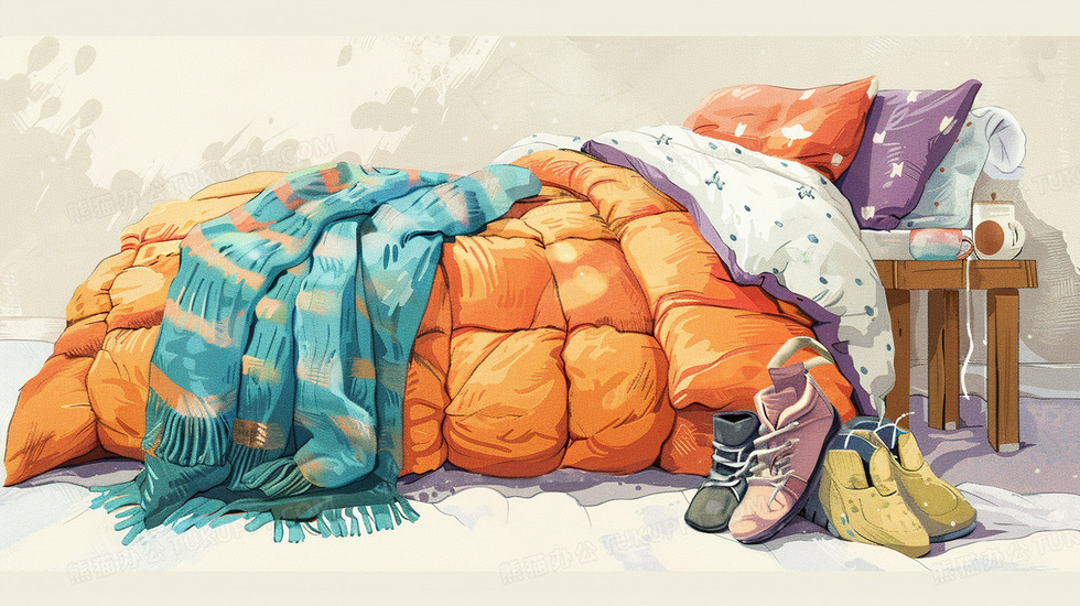 本作品内容为冬天床上厚被子厚衣服围巾保暖用品插画, 格式为 jpg, 大小5 MB, 图片尺寸为2912 x 1632, 源文件无水印, 欢迎使用熊猫办公。 如认为平台内容涉嫌侵权,可通过邮件:tousu@tukuppt.com提出书面通知,我们将及时处理。