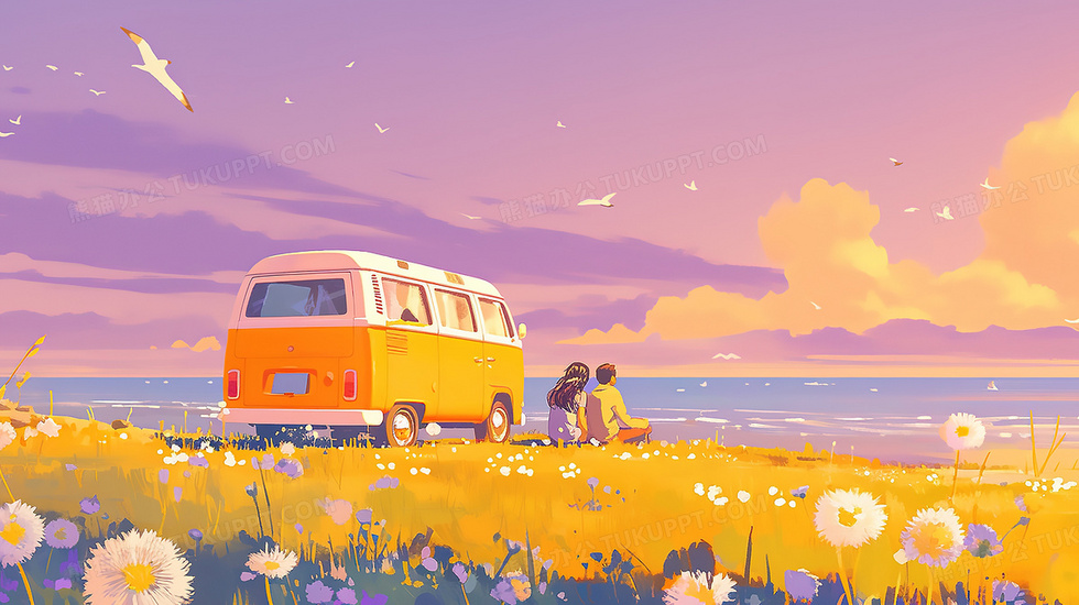 本作品内容为秋日男孩女孩房车海边旅游插画, 格式为 jpg, 大小3 MB, 图片尺寸为2912 x 1632, 源文件无水印, 欢迎使用熊猫办公。 如认为平台内容涉嫌侵权,可通过邮件:tousu@tukuppt.com提出书面通知,我们将及时处理。