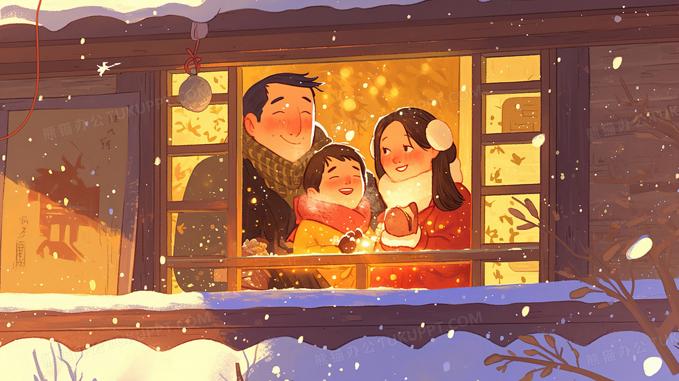 本作品内容为冬季窗边看雪景的一家人温馨插画, 格式为 jpg, 大小8 MB, 图片尺寸为5824 x 3264, 源文件无水印, 欢迎使用熊猫办公。 如认为平台内容涉嫌侵权,可通过邮件:tousu@tukuppt.com提出书面通知,我们将及时处理。