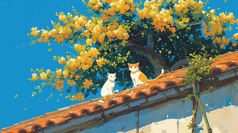 本作品内容为秋天屋顶猫咪蓝天白云桂花插画, 格式为 jpg, 大小4 MB, 图片尺寸为2912 x 1632, 源文件无水印, 欢迎使用熊猫办公。 如认为平台内容涉嫌侵权,可通过邮件:tousu@tukuppt.com提出书面通知,我们将及时处理。