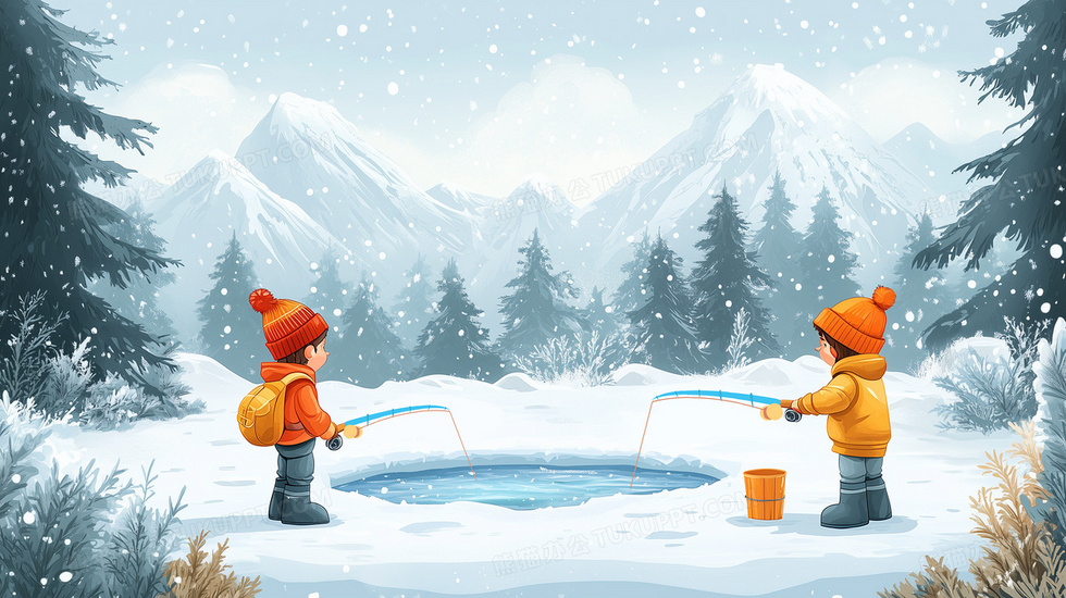 本作品内容为冬令营两个小朋友在湖面冰钓插画, 格式为 jpg, 大小6 MB, 图片尺寸为2912 x 1632, 源文件无水印, 欢迎使用熊猫办公。 如认为平台内容涉嫌侵权,可通过邮件:tousu@tukuppt.com提出书面通知,我们将及时处理。
