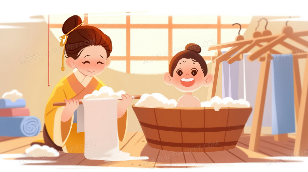 本作品内容为妈妈给孩子用木桶洗澡插画, 格式为 jpg, 大小2 MB, 图片尺寸为2912 x 1632, 源文件无水印, 欢迎使用熊猫办公。 如认为平台内容涉嫌侵权,可通过邮件:tousu@tukuppt.com提出书面通知,我们将及时处理。