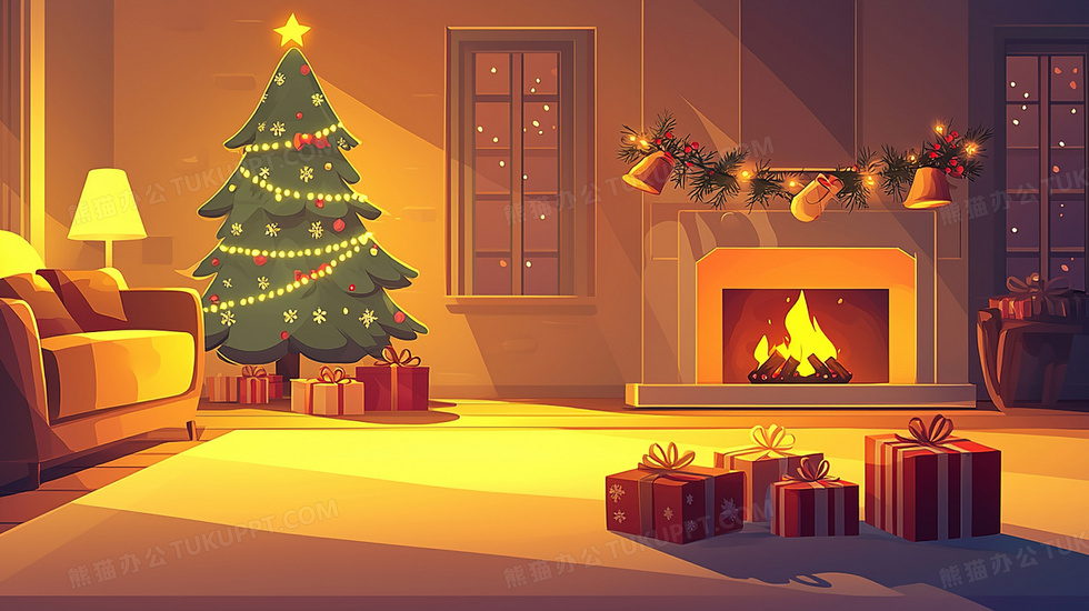 本作品内容为室内圣诞树礼盒装饰氛围壁炉插画, 格式为 jpg, 大小2 MB, 图片尺寸为2912 x 1632, 源文件无水印, 欢迎使用熊猫办公。 如认为平台内容涉嫌侵权,可通过邮件:tousu@tukuppt.com提出书面通知,我们将及时处理。