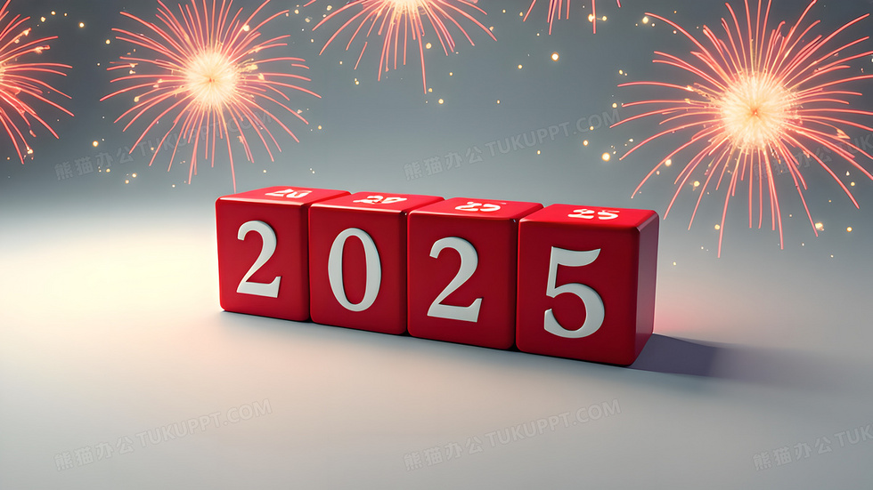 本作品内容为红色方块2025数字烟花背景, 格式为 jpg, 大小5 MB, 图片尺寸为3072 x 1728, 作品中背景图片无需修改, 源文件无水印,可以直接使用, 欢迎使用熊猫办公。 如认为平台内容涉嫌侵权,可通过邮件:tousu@tukuppt.com提出书面通知,我们将及时处理。