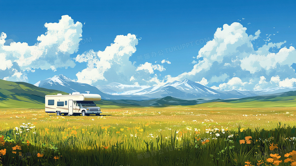 本作品内容为草原上的旅行房车插画, 格式为 jpg, 大小4 MB, 图片尺寸为2912 x 1632, 源文件无水印, 欢迎使用熊猫办公。 如认为平台内容涉嫌侵权,可通过邮件:tousu@tukuppt.com提出书面通知,我们将及时处理。