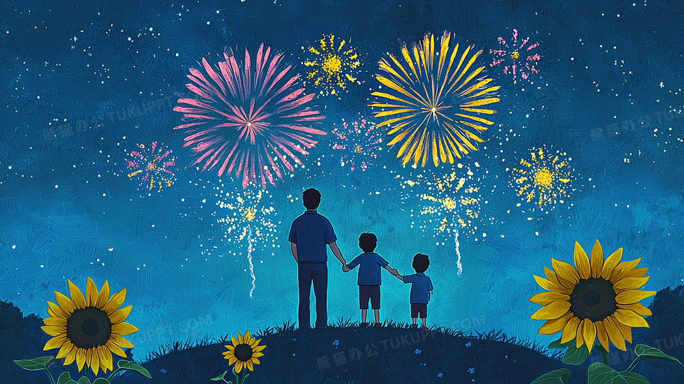本作品内容为父母和孩子向日葵花海看璀璨烟花插画, 格式为 jpg, 大小4 MB, 图片尺寸为2912 x 1632, 源文件无水印, 欢迎使用熊猫办公。 如认为平台内容涉嫌侵权,可通过邮件:tousu@tukuppt.com提出书面通知,我们将及时处理。