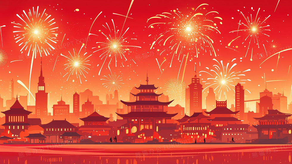 本作品内容为跨年夜城市上空绽放唯美烟花插画, 格式为 jpg, 大小3 MB, 图片尺寸为2912 x 1632, 源文件无水印, 欢迎使用熊猫办公。 如认为平台内容涉嫌侵权,可通过邮件:tousu@tukuppt.com提出书面通知,我们将及时处理。