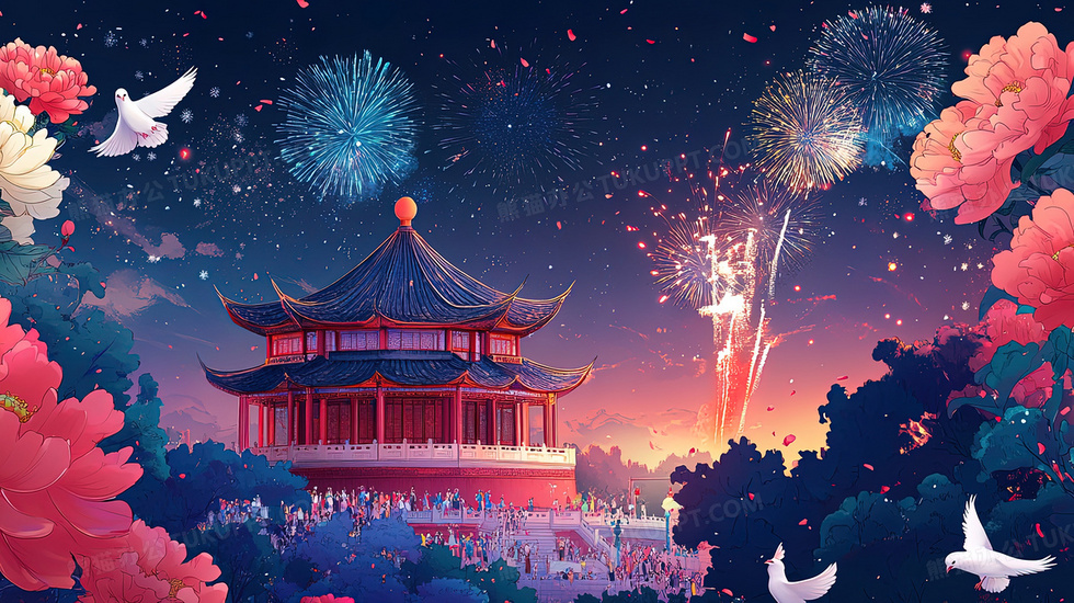 本作品内容为庆祝国庆放烟花牡丹白鸽建筑插画, 格式为 jpg, 大小4 MB, 图片尺寸为2912 x 1632, 源文件无水印, 欢迎使用熊猫办公。 如认为平台内容涉嫌侵权,可通过邮件:tousu@tukuppt.com提出书面通知,我们将及时处理。
