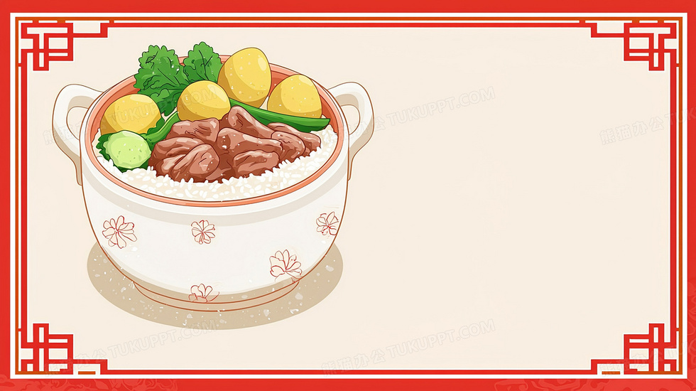 本作品内容为中餐美食砂锅饭鸡蛋炒肉背景, 格式为 jpg, 大小2 MB, 图片尺寸为2912 x 1632, 作品中背景图片无需修改, 源文件无水印,可以直接使用, 欢迎使用熊猫办公。 如认为平台内容涉嫌侵权,可通过邮件:tousu@tukuppt.com提出书面通知,我们将及时处理。