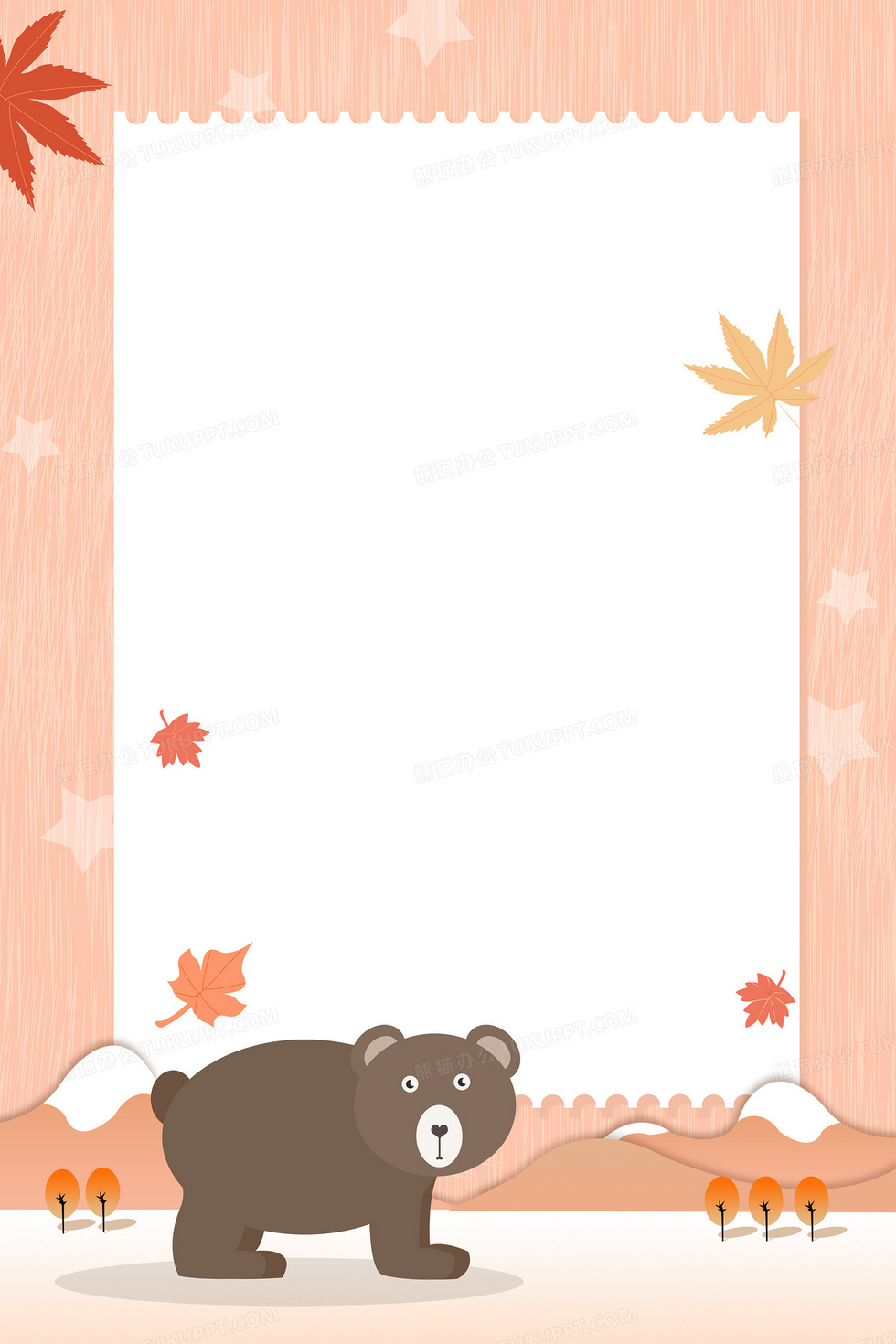 本作品内容为扁平简约风卡通棕熊边框背景, 格式为 psd, 大小21 MB, 图片尺寸为3543 x 5315, 作品中背景图片无需修改, 源文件无水印,可以直接使用, 欢迎使用熊猫办公。 如认为平台内容涉嫌侵权,可通过邮件:tousu@tukuppt.com提出书面通知,我们将及时处理。