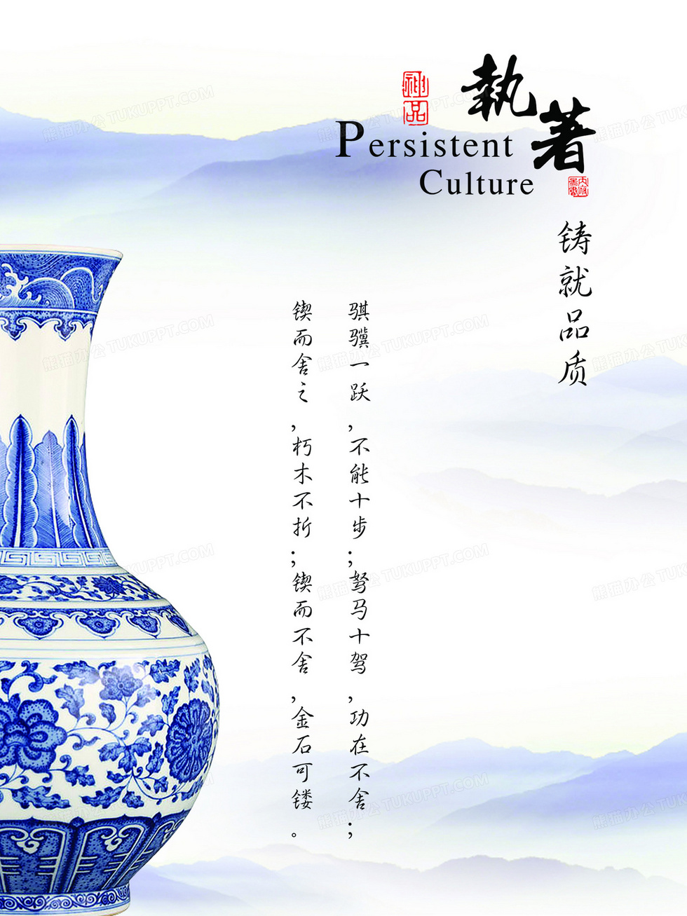 本作品内容为企业文化执着青花瓷海报背景, 格式为 psd, 图片尺寸为3544 x 4725, 作品中背景图片无需修改, 源文件无水印,可以直接使用, 欢迎使用熊猫办公。 如认为平台内容涉嫌侵权,可通过邮件:tousu@tukuppt.com提出书面通知,我们将及时处理。