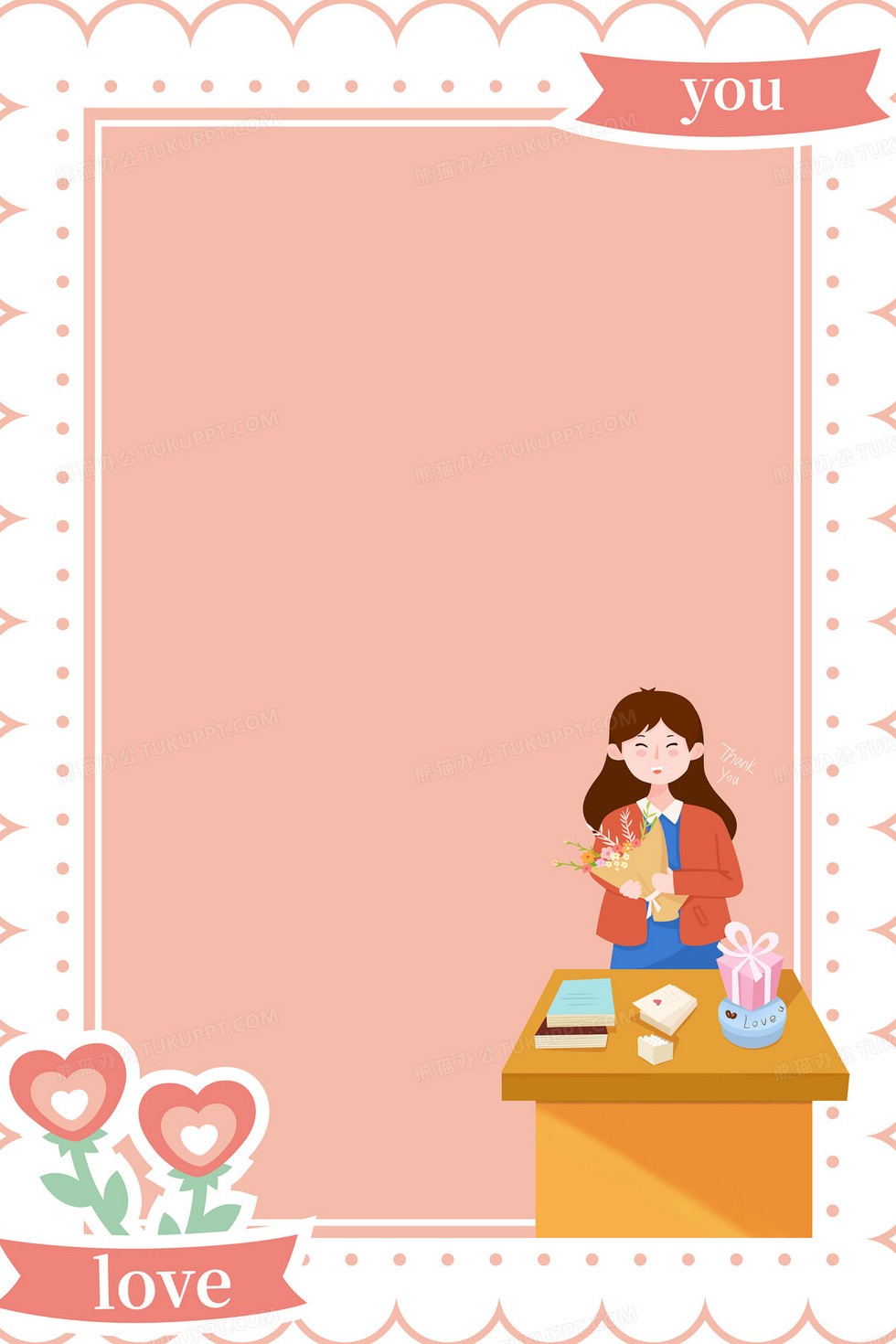 本作品内容为教师节粉色爱心背景, 格式为 psd, 大小4 MB, 图片尺寸为3543 x 5315, 作品中背景图片无需修改, 源文件无水印,可以直接使用, 欢迎使用熊猫办公。 如认为平台内容涉嫌侵权,可通过邮件:tousu@tukuppt.com提出书面通知,我们将及时处理。