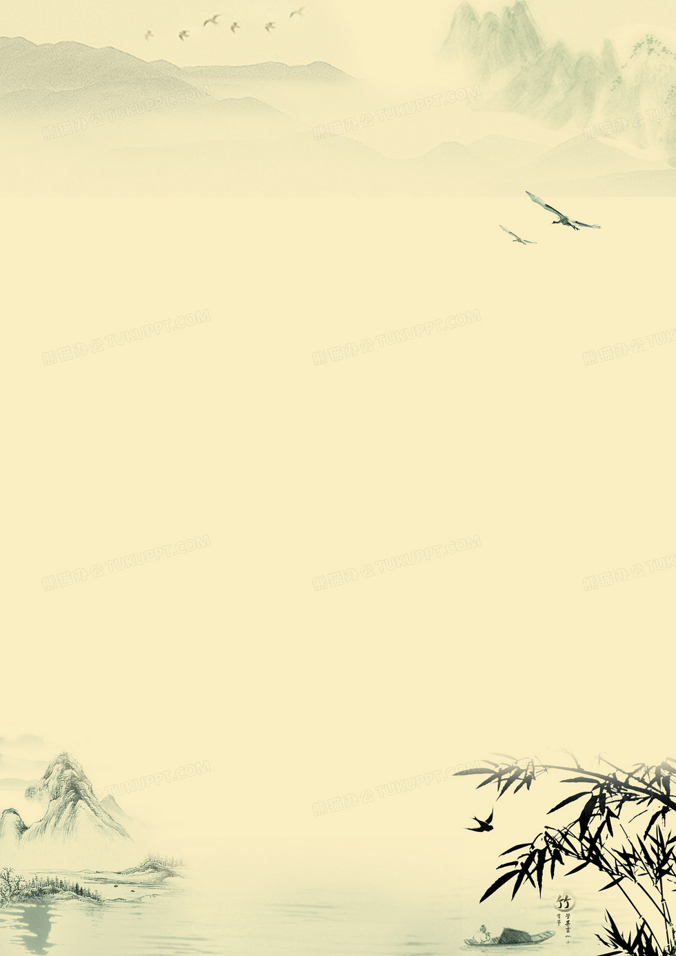 本作品内容为中国风水墨山水背景, 格式为 jpg, 图片尺寸为2480 x 3508, 作品中背景图片无需修改, 源文件无水印,可以直接使用, 欢迎使用熊猫办公。 如认为平台内容涉嫌侵权,可通过邮件:tousu@tukuppt.com提出书面通知,我们将及时处理。