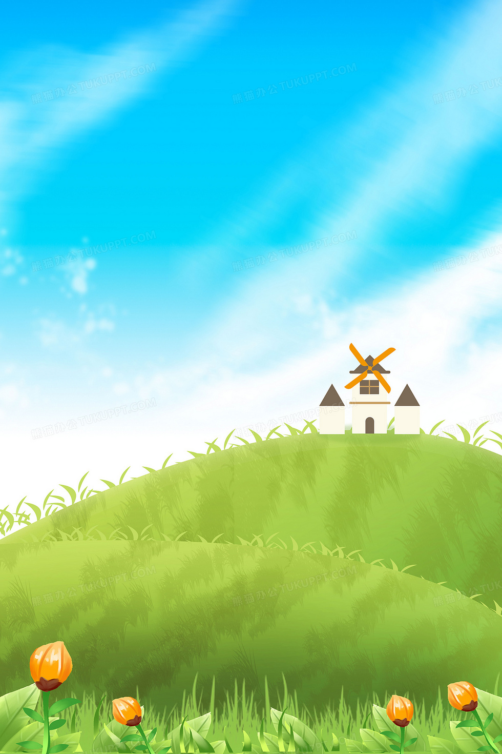 本作品内容为草地小清新风车插画风背景, 格式为 psd, 大小211 MB, 图片尺寸为7086 x 10631, 作品中背景图片无需修改, 源文件无水印,可以直接使用, 欢迎使用熊猫办公。 如认为平台内容涉嫌侵权,可通过邮件:tousu@tukuppt.com提出书面通知,我们将及时处理。