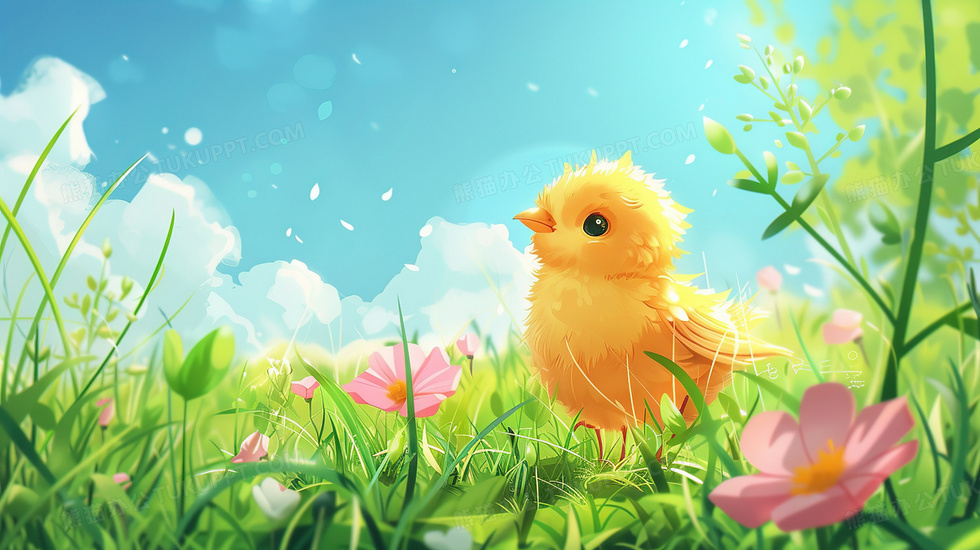 本作品内容为草地上的粉色花朵和小黄鸡插画, 格式为 jpg, 大小3 MB, 图片尺寸为2912 x 1632, 源文件无水印, 欢迎使用熊猫办公。 如认为平台内容涉嫌侵权,可通过邮件:tousu@tukuppt.com提出书面通知,我们将及时处理。